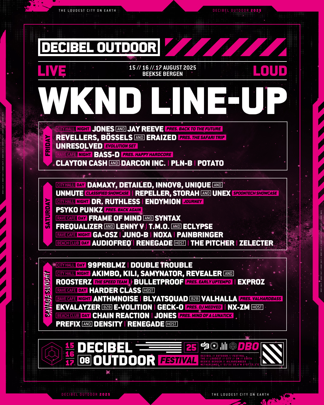Decibel outdoor heeft zojuist de WKND line-up voor 2025 bekendgemaakt. Van 15 tot en met 17 augustus barst het feest los in de Beekse Bergen, waar de ware die-hards niet alleen op het festivalterrein, maar ook op de camping kunnen genieten van een non-stop ervaring: LIVE LOUD dag en nacht.