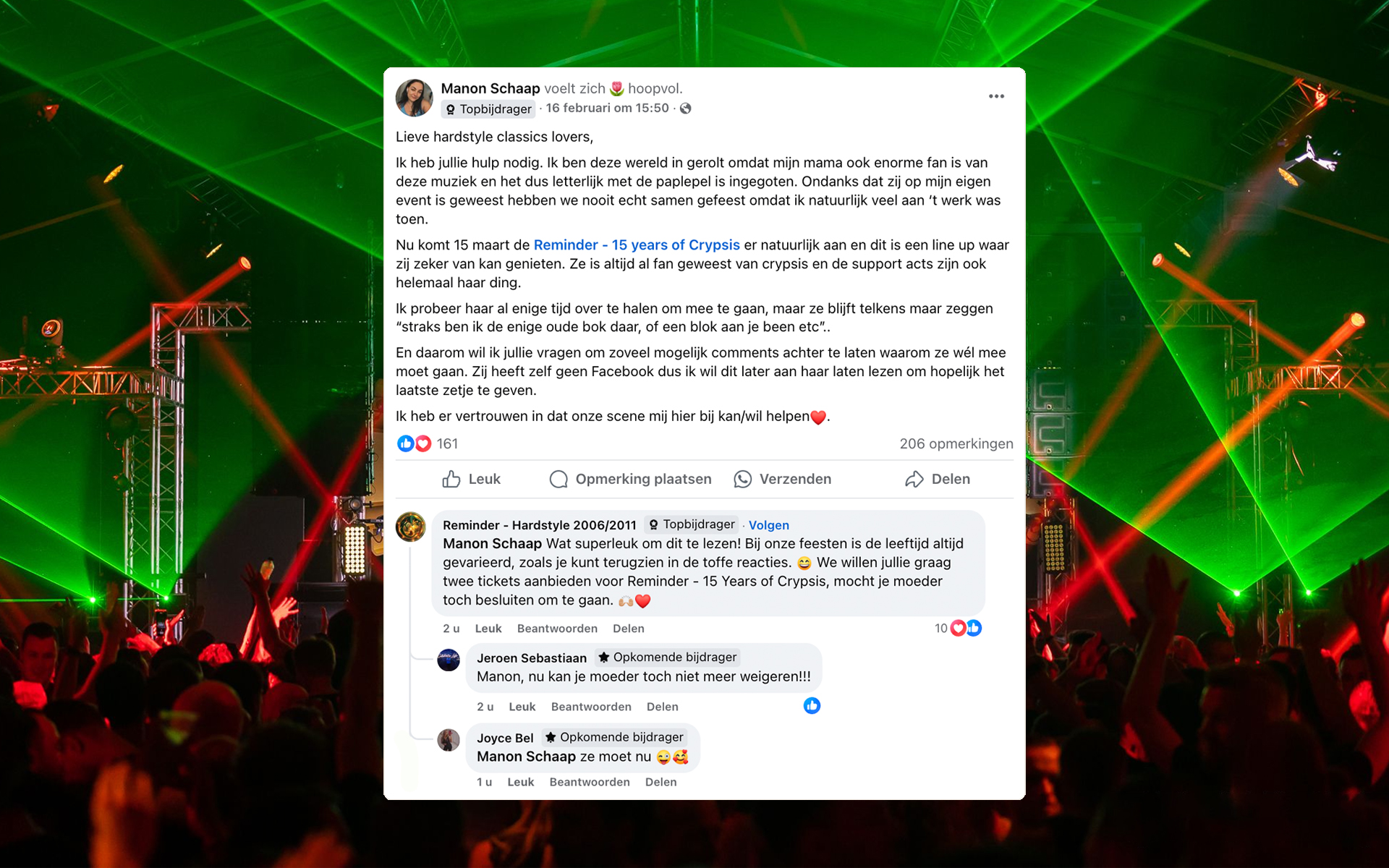 De hardstyle-liefhebber roept de community op om haar moeder te overtuigen om mee te gaan naar Reminder – 15 Years of Crypsis. “De liefde voor hardstyle kreeg ze met de paplepel ingegoten, maar echt samen feesten met haar moeder is er nooit van gekomen”, zegt de dochter in de Hardstyle Classics Lovers-groep. Hoewel haar moeder fan is van Crypsis en de support acts, twijfelt ze of ze wel op haar plek is en vreest ze een “oude bok” of “blok aan het been” te zijn. Via social media vraagt de dochter om massale steun, en fans reageren enthousiast met berichten dat hardstyle voor iedereen is, ongeacht leeftijd.