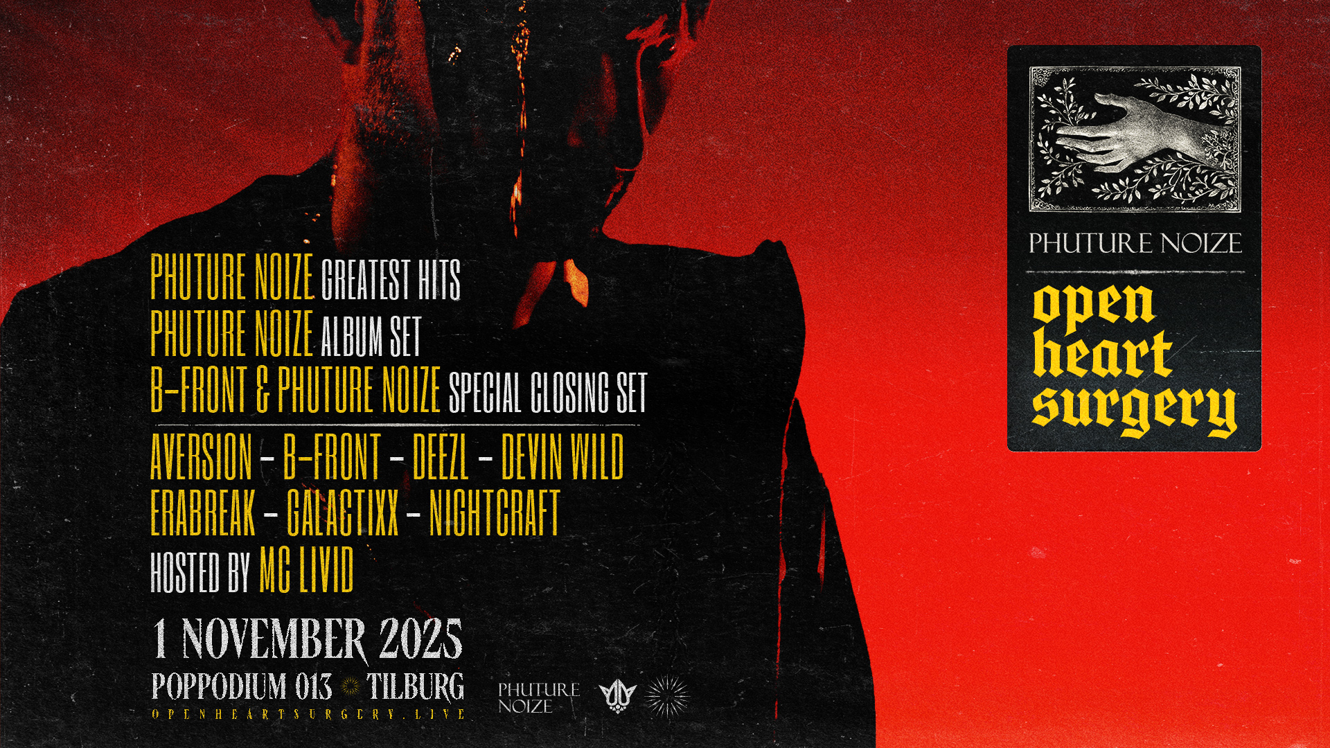 Phuture Noize – Open Heart Surgery takes place on Saturday, November 1, 2025, at Poppodium 013 in Tilburg, in collaboration with REBiRTH Events. Phuture Noize is looking forward to sharing his new body of work with fans in a way that goes beyond just music. “I hope to see you there on November 1,” he says in the trailer. “You can register now to be the first to buy tickets.”
