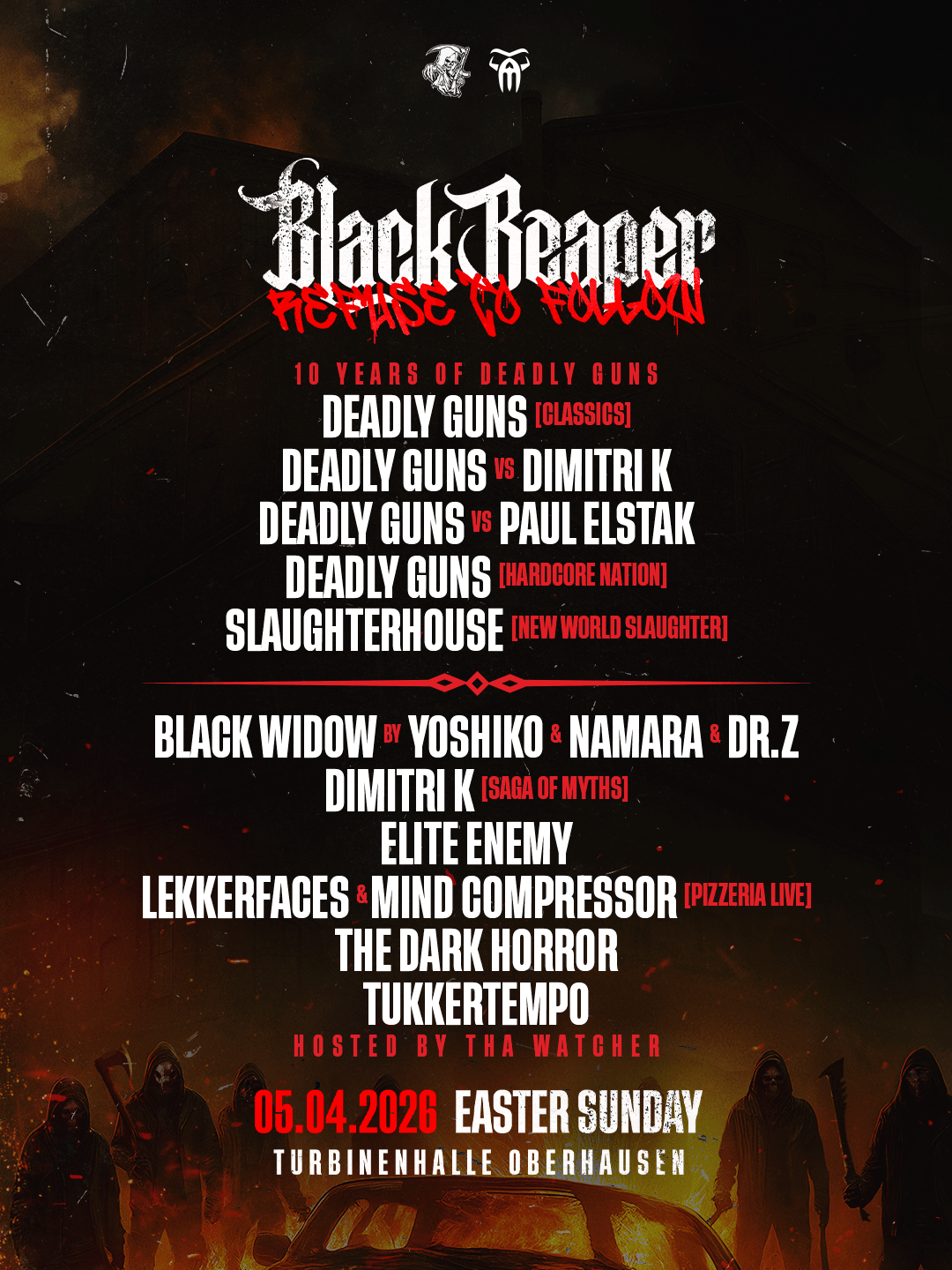 Voordat Faceless de show naar buiten verplaatst, organiseert het label nog twee indoor evenementen. Op 5 april keert hardcore-artiest Deadly Guns terug met een grootschalige labelshowcase. Zijn kenmerkende kicks, onstuitbare drive en het gezamenlijke project Slaughterhouse met N-Vitral hebben hem een vaste plek in de uptempo scene bezorgd. Black Reaper’s ‘Refuse To Follow’ is een viering van het label en van tien jaar Deadly Guns.