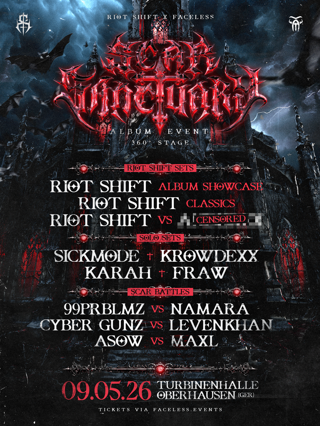 Riot Shift SCAR SANCTUARY vindt plaats in de Turbinenhalle in Oberhausen op 9 mei 2026. Tickets en informatie zijn verkrijgbaar via het Instagram-account van Faceless.