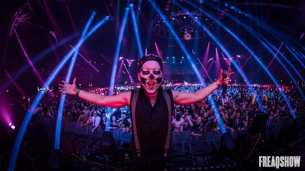 “We put the FUN in funeral”, dat was de slogan waar we op Freaqshow mee verwelkomd werden. De kracht van Freaqshow is de vrijheid om zo eng mogelijk verkleed naar het feest te komen. Zombies? Check. Enge clowns? Check. Mensen met bloederige wonden? Check! The Joker en Harley Quinn? Drie dubbel check. Ja, mensen hadden uitgepakt voor het feest waar menig hardstyle liefhebber het hele jaar naar uitkijkt: Freaqshow.